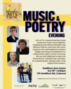 Colwood’s new arts centre is called the Goldfinch Arts Centre. Featuring visual arts and a beautiful reading space, it’s perched near the Esquimalt Lagoon, with walking trails and a poetry post nearby. Barbara Pelman and I gave the inaugural poetry reading there in October, accompanied by musicians Doug & Shelley Thorsteinson, and David Grove, one of the municipality’s councilors who helped make this centre a reality.