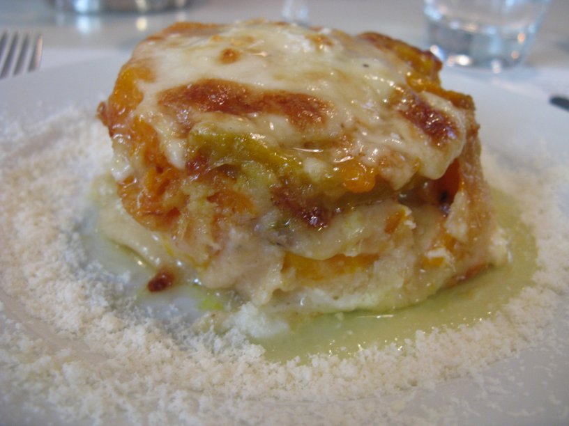 For lunch, I went to La Croce di Malta, where there is always something imaginative to be found in the vegetable starters. This time it was a sformato di zucca – a juicy and seasonal pumpkin and potato cake, larded with mushrooms and mozzarella, and sprinkled prettily with Parmigiano-Reggiano. One bliss was followed by another: polpo (octopus) with potato mashed with celery and a pleasingly crisp and bitter little side salad freckled with salt.