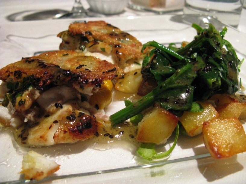 Here we have insalata di polpo e patate alle olive con involtino di gamberi croccante e wasabi mayo (octopus salad with olives and potatoes with a crunchy prawn roll and wasabi mayo), followed by Branzino in carrozza alle olive con patate, carciofi e salsa al marsala (sea bass with potatoes, olives, artichokes and Marsala sauce): in carrozza is something usually done with mozzarella, a kind of grilled cheese sandwich, but here it was so very much not that, and had a bit of ginger and sesame seasoning, and a bit of zucca (pumpkin) for sweetness and colour.
