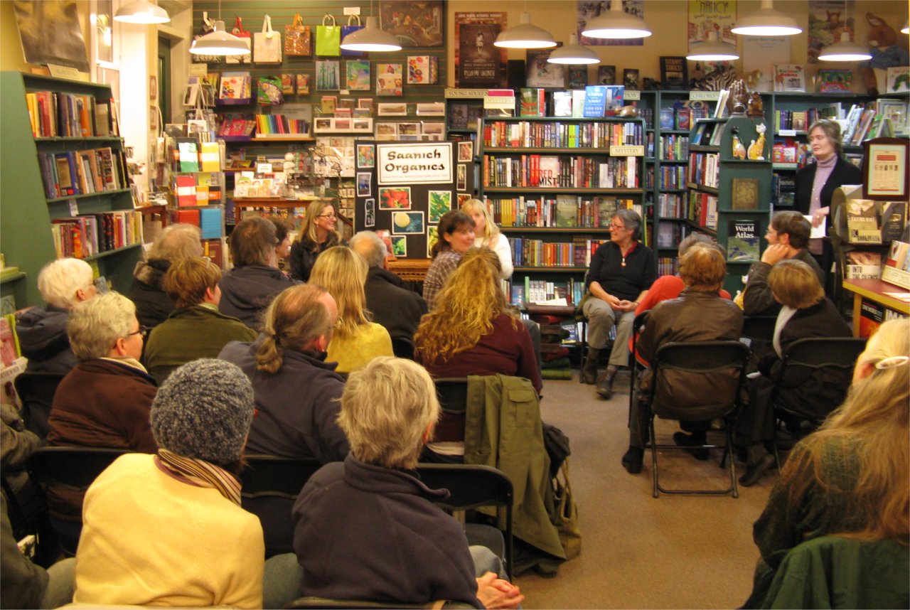 I had the chance a couple of weeks ago to mosey down to Cadboro Bay Books to catch Farmers at the Mike – an evening with organic farmer-authors Heather Stretch, Robin Tunnicliffe, Rachel Fisher (who make up Saanich Organics) with special guests Mary Alice Johnson and Lana Popham. They were promoting All the Dirt: Reflections on Organic Farming and talking about the life and times of organic farming. It was a packed house and a congenial time.