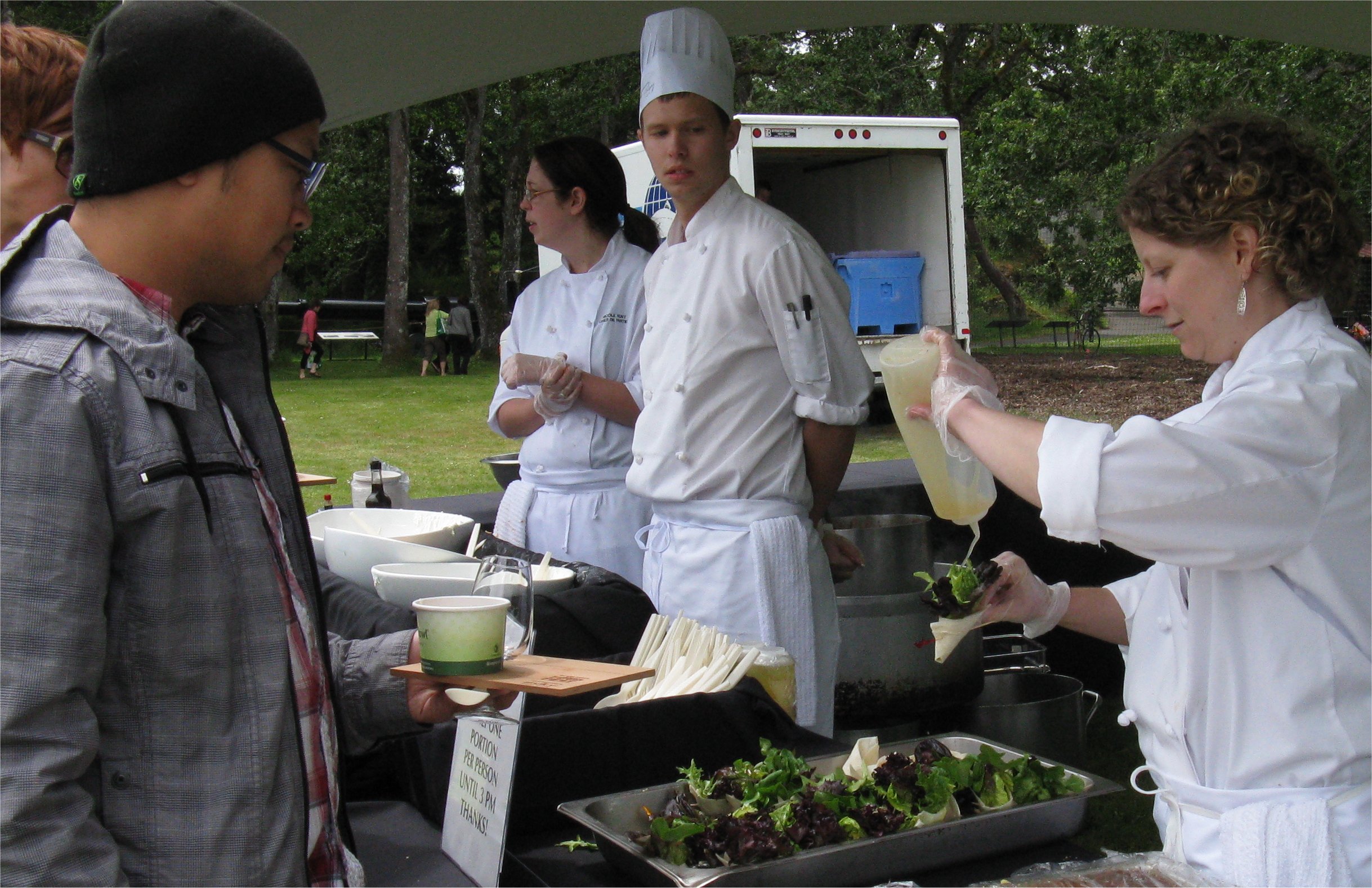 There was a lot on offer, but not so much that a hungry diner couldn’t manage to sample it all at least once. Hungry and thirsty diners were pretty much out of luck, though, since the fine minds of the BC Liquor Control Board had deemed it necessary to sequester the alcohol into an undersized tent entirely separate from the food it was meant to accompany. This is the same sharp thinking that prevents the apparently uncontrollable drinkers of British Columbia from enjoying a glass of wine with their meal on the ferries, a task that Europeans have been managing for decades without mass drunkenness. And just last month I witnessed numerous brave Americans taking beer or wine with their otherwise unspeakable meals on one of the Washington State Ferries, and we all drove off that ship without any trouble.