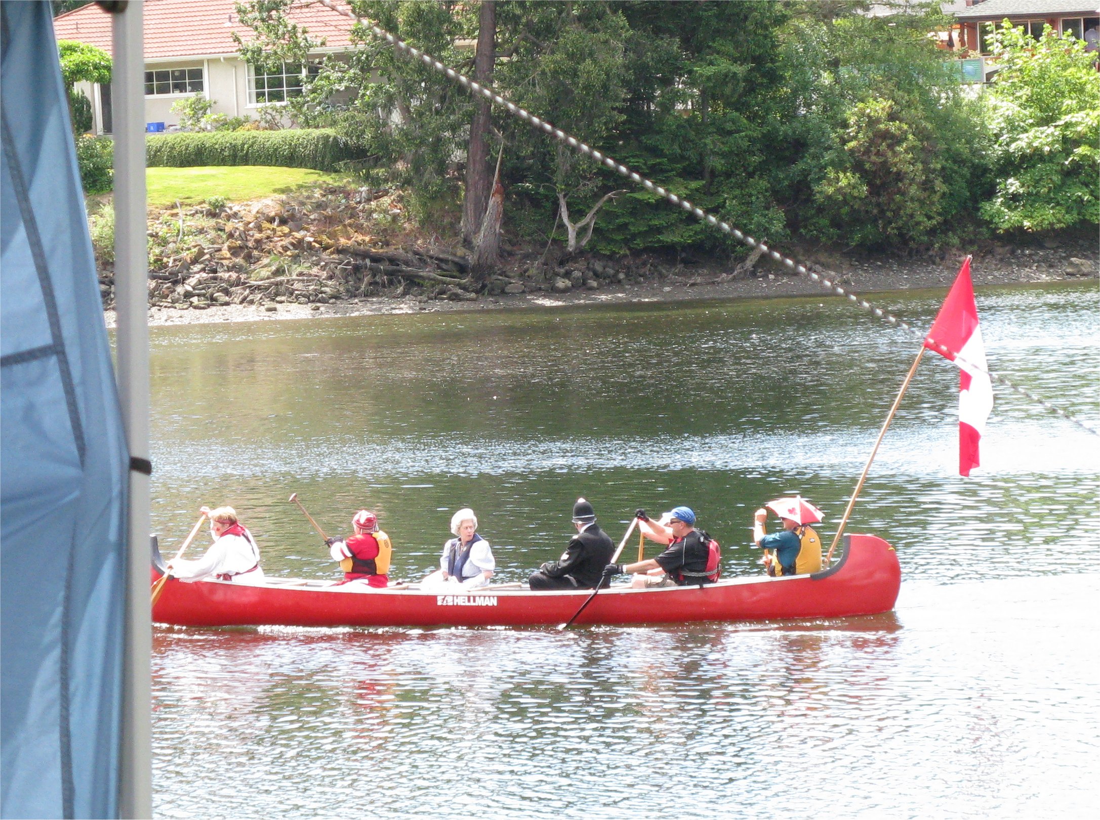 After that it was time for Canada Day celebrations. Here on the Gorge we have a street party that this year was graced by the queen, who also deigned to have her picture taken with neighbourhood dogs, and was then whisked away by canoe. There was of course food, music and a little dancing.