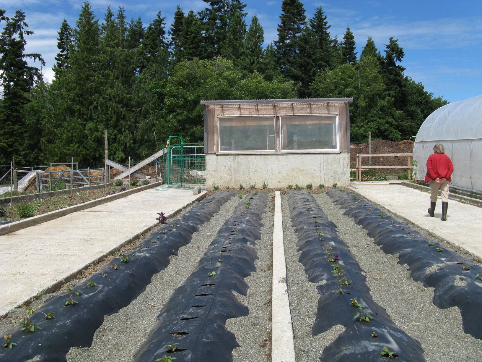 Towards the end of the tour we had a look at the sweet potatoes bravely growing under black plastic mulch. They were planted out in March, but the weather has been so chilly that they are not thriving, although with luck the summer heat should kick in and move them along. At the end of the rows is the winter pig barn, where the porkers can loll about enjoying the roasted sweet potatoes the Perrieras prepare for them (many of the larger sweet potatoes are considered unsaleable, so they go to the lucky pigs).