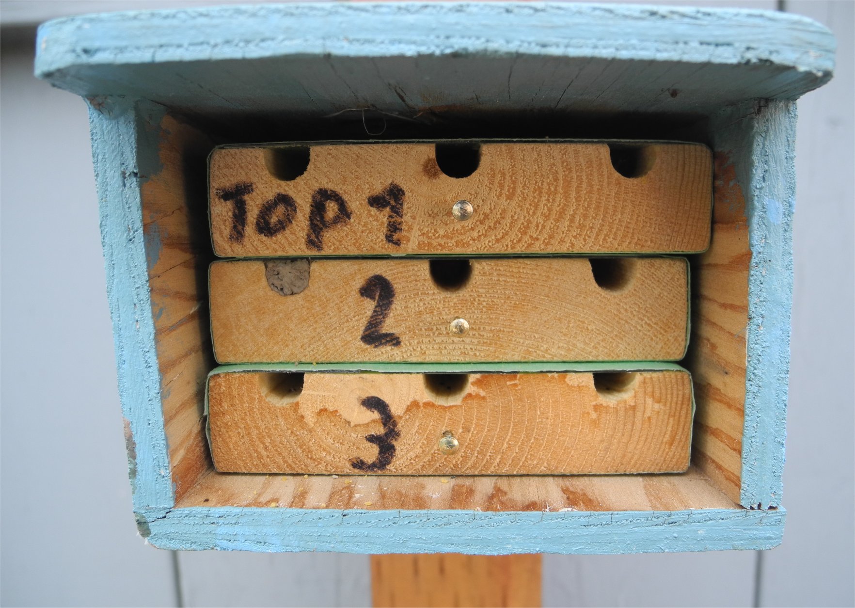 I’d read that the houses were best positioned on an east-facing wall where sunlight could warm them, but my bees seemed perfectly happy to populate the west-facing, shaded condo next door to the Bombus (bumblebee) house (where a tribe of feisty Bombus vosnesenskii have settled in for the season)
