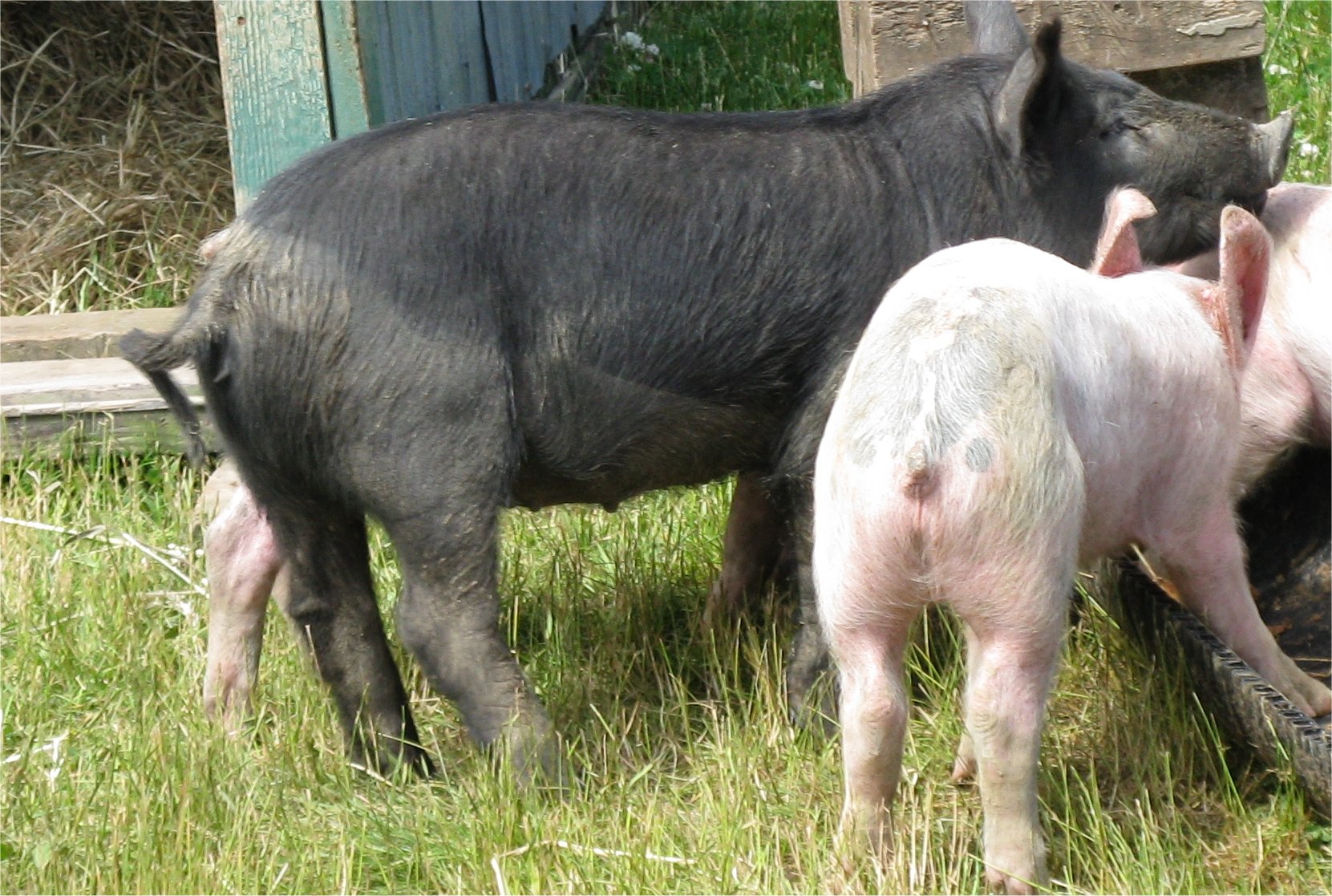 heaven, and then they die. They’re fed organic grain, fresh greens and roast sweet potatoes grown on the farm. Ten of their Berkshires, purchased as piglets from Tom Henry (there are very few organic pig breeders, Evelyn remarked), were nearing their slaughter date, and were out frolicking in a field of greens. They came to greet us, flapping their enormous eyelashes and making us question who was looking at whom. I’ve been on pig farms before, and never have I been to one where there was not a whiff of stink: they have plenty of room to run and play, and shelters provided for both summer and winter comfort.There were some piglets in another field: two varieties, black mule pigs (sourced from Lasqueti Island) and some Tamworth cross pigs bought from a commercial operation in Alberta. The white pigs were very skittish at first and prone to scattering when Jesse approached, but with patience he has been able to get them to become a bit more pig-like, curious and friendly. The white ones’ tails had been docked by the breeder, a common practice where they are kept in such overcrowded conditions they are likely to gnaw on their neighbours out of stress or for lack of anything better to do. Evelyn said they hadn’t checked their teeth but these were likely clipped as well, for similar reasons.