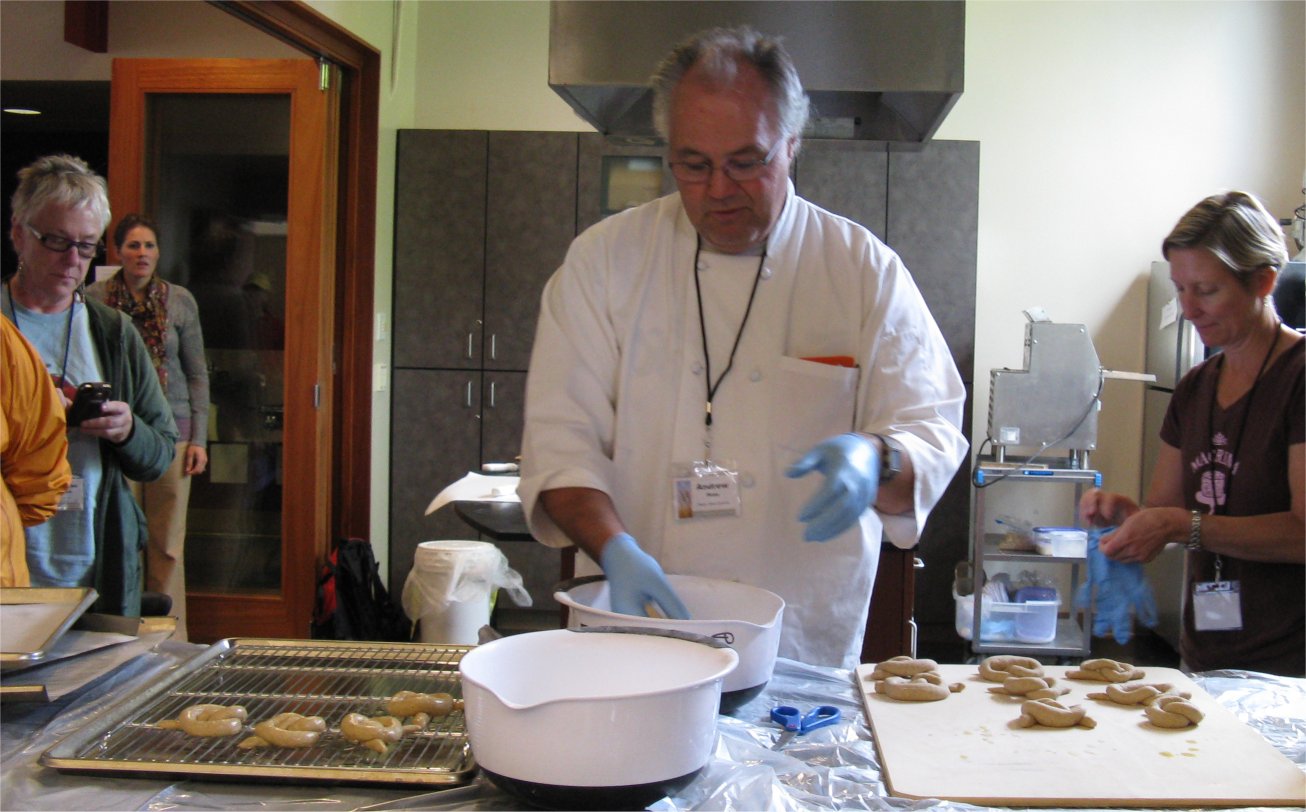 Andrew Ross, who teaches Crop & Food Science at Oregon State University but has a background as a baker, showed us some 50% barley bread, a 10% barley levain and then proceeded to make barley pita breads and lye-dipped barley pretzels.