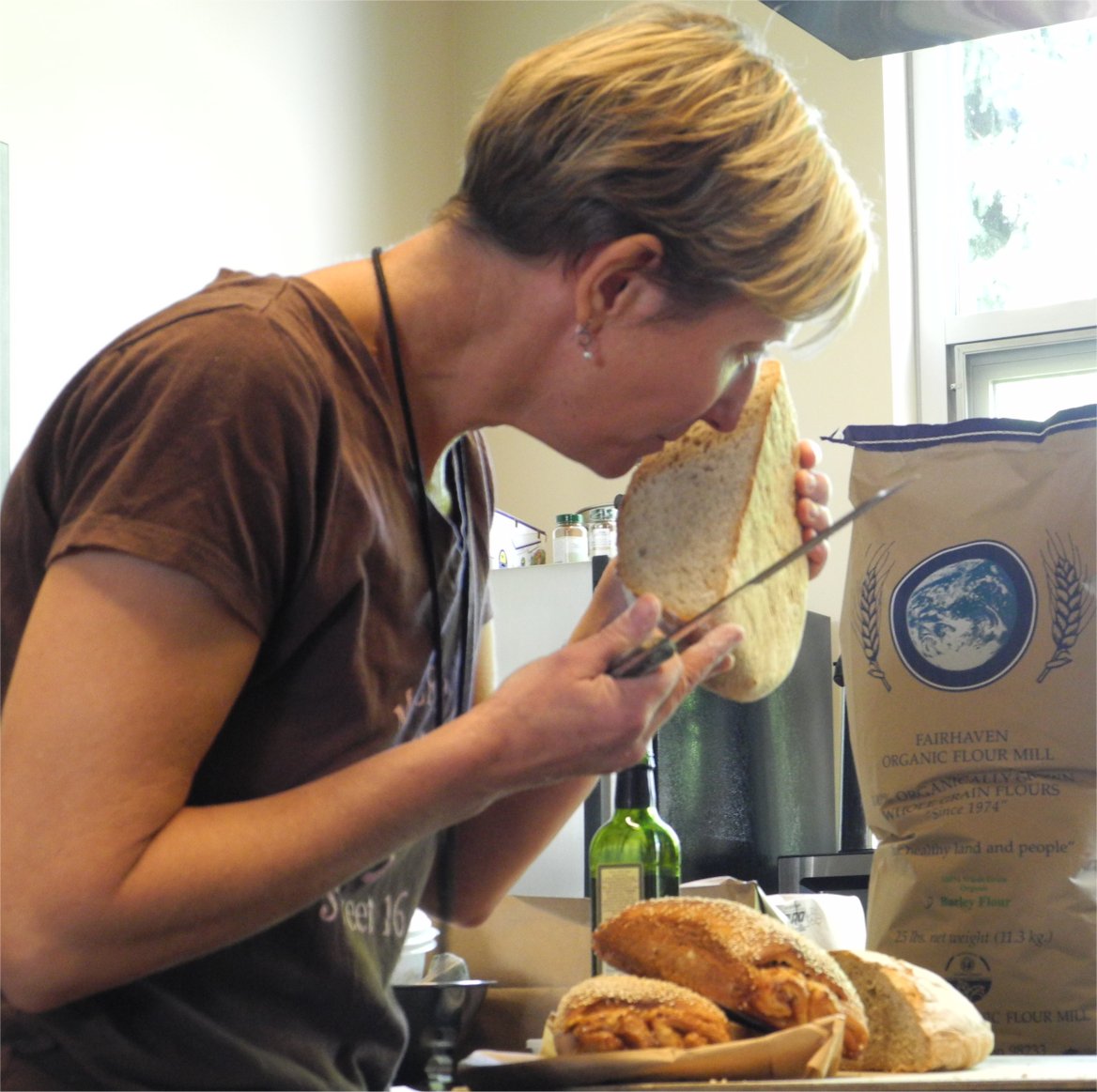 After that, it was a day of impossible choices. I decided to learn about baking with barley, since that was an idea that had never crossed my mind. Two impeccably qualified bakers showed us some tricks and discussed the challenges of working with a flour that is flavourful and high in beta glucan, but pretty much completely lacking in tensile strength, so it needs to be paired with a high gluten flour. Leslie Mackie, of Macrina Bakery, had used barley flour in her Monkey Bread and gave us a firsthand view of how a recipe is developed. Here she checks the crumb of two sample batches of a barley Pugliese loaf, which is made with 20-30% barley flour.