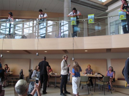 Read Full Post: ALECC 2012 – Space + Memory = Place (days 4&5)Saturday morning we repaired (by schoolbus) to the beautiful spaces at Okanagan College, where the luckiest presenters spoke in the curvy pod at the top of the stairs, but really everything was lovely there, including a fine breakfast of fresh muffins (featuring Okanagan apricots) and lots of fruit.