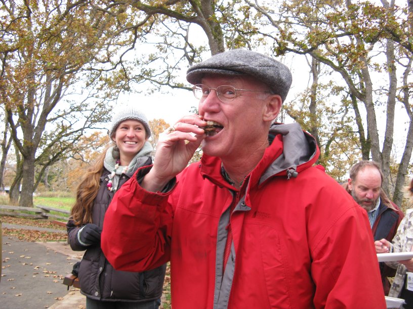I attended a workshop yesterday organized by the Victoria Transition Capital Nut Project in Playfair Park, a restored Garry Oak Meadow in Victoria. It attracted a couple of dozen brave souls willing to stand in the November chill and learn how to make Garry Oak acorns edible. Being the proud custodian of a very large