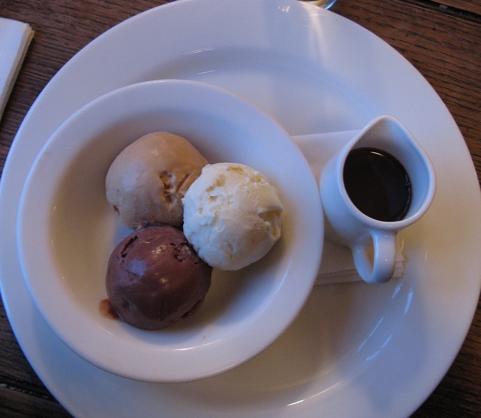 We commenced with potted Suffolk ham hock and very fine toasted sourdough, accompanied by a few darling cornichons and pickled onions, and a pear and Cheshire blue cheese salad sprinkled with toasted pine nuts. We moved smoothly on to a melting featherblade of beef with herbed dumplings. kale mash and tiny roast onions. Thus fortified we were able to take a calm, clear look at the desserts which all sounded spectacular. One of the finest was a hot chocolate pudding with salt caramel ice cream. Just to make sure the chef had chosen the right ice cream to go with this (he had, oh yes he had) we checked out the chocolate and ginger flavours as well, bathing them in warm chocolate sauce for good measure. If this is to be my fate in 2012, bring it on. -