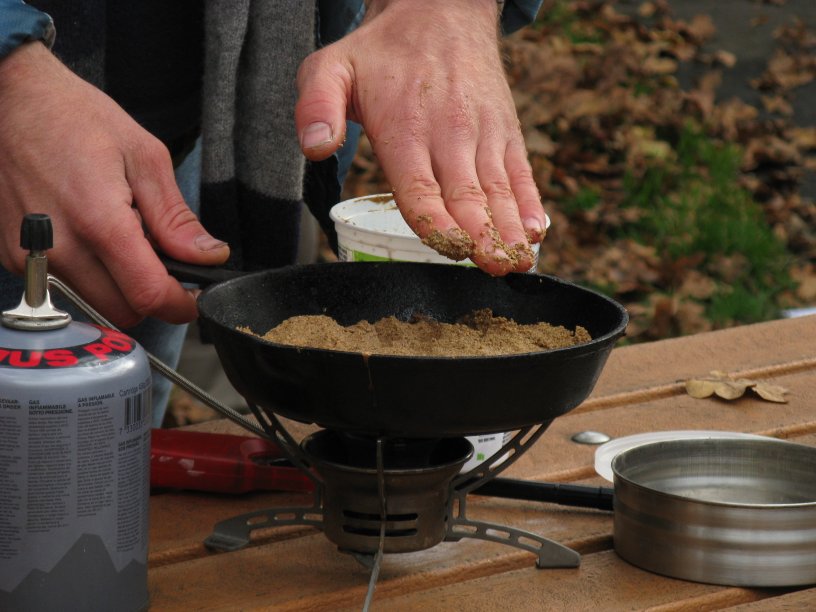 As it circulated, Abe invited us to have a sniff and a taste of the flour. We could smell the sugars in the flour, but it tasted bitter, because of the high tannin content in these acorns. The next step was to leech out these tannins, by soaking the flour in water for four or five days, pouring the liquids off morning and night, and then tasting the final product to check for bitterness. The colour of the liquid changes, growing lighter as the tannins are removed. The final sludge can be used straight away as a batter for flatbread, or dried and used with flour for flavour (bearing in mind it is low in glutens so wouldn’t make great yeast bread on its own).