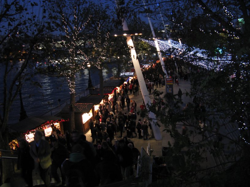 tral London ambled across the footbridge from the Embankment to the Southbank Centre which is hosting a Christmas market, which was thronged. It had a lot of stalls selling everything from churros and sausages and ostrich burgers to Peruvian knitting, wooden knick-knacks and jewellery that, luckily for my finances, I found of little interest. Though luckily for the traders, not a view that everyone shared as many were very busy – notably the ones selling a fairly foul-smelling Glühwein.We stopped for a bite at an Italian chain outlet, where I twice sent back my pasta with melanzane which was, twice, badly undercooked (this is why eggplant/aubergine has had such a bad rap, imho: I’ve found only Indian restaurants seem to reliably understand how to prepare to the correct texture this most delicious vegetable)(–tho botanically a fruit, of course). The manager was most understanding and said he agreed with me and would have a word with the chef and offered us a drink and dessert in compensation. But right at the next table I watched someone chew his way through a bowl of the stuff without a whimper. If he’d had a shred of awareness about what he’d been eating and didn’t realize how foully abused it had been he should have gone home grumbling about how he doesn’t really like aubergine and vowing not to order it again.