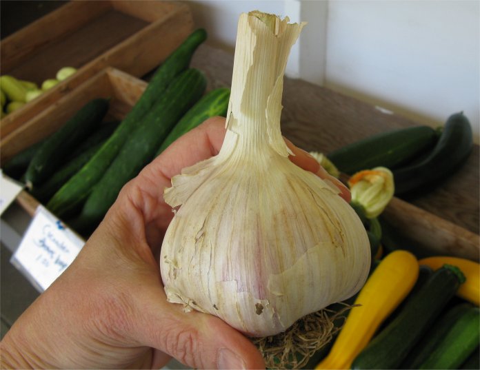 It’s all about the garlic just now. Harvests are in. Those who haven’t experienced devastating losses due to excess moisture and rot are crowing about the enormous healthy bulbs that are popping up at farm stands all over Vancouver Island. They cost between $2 and $3 a bulb at farmers markets; more than that if sold by weight, as they’re plump, fresh and juicy and a world away (literally) from the cheap bulbs from China.Farmer Ray at Haliburton Farm certainly has something to crow about. Customer after
