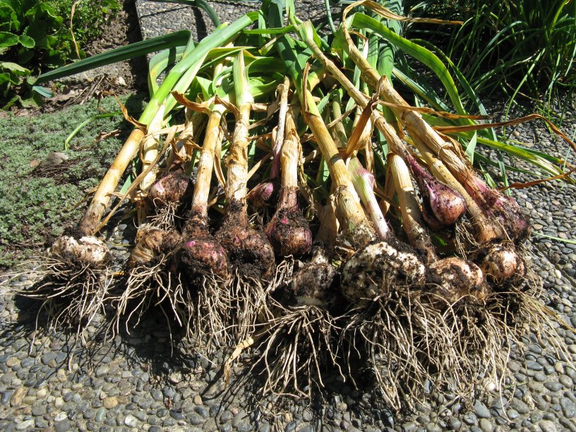 My own yield – harvested nearly two weeks ago – was more modest, but I believe all 14 cloves I planted came up and, aside from some split bulbs the bulbs look healthy and firm with no sign of mold. Like last year, they showed some rust that had persisted on the overwintering leeks, despite ministrations with home-made sulfur spray. It didn’t affect the bulbs, though, and they’re drying in an airy corner of the shed as I write.After they’ve dried properly in another few days I’ll cut them down and peel off the grubby wrappers. The choicest bulbs will be saved for seed. One thing I learned this year, thanks to a lively discussion on the COG listserve, was to check the base of the cloves for two distinct ‘footprints’ – and if found, to separate the cloves even if there is only one clove skin, because otherwise they’ll split after planting. I did successfully pull up and replant a split clove but it’s not recommended. The fatter the bulb and cloves you plant, the bigger your plants will be next year, says Ray.