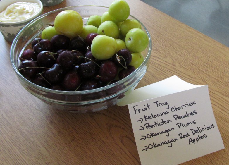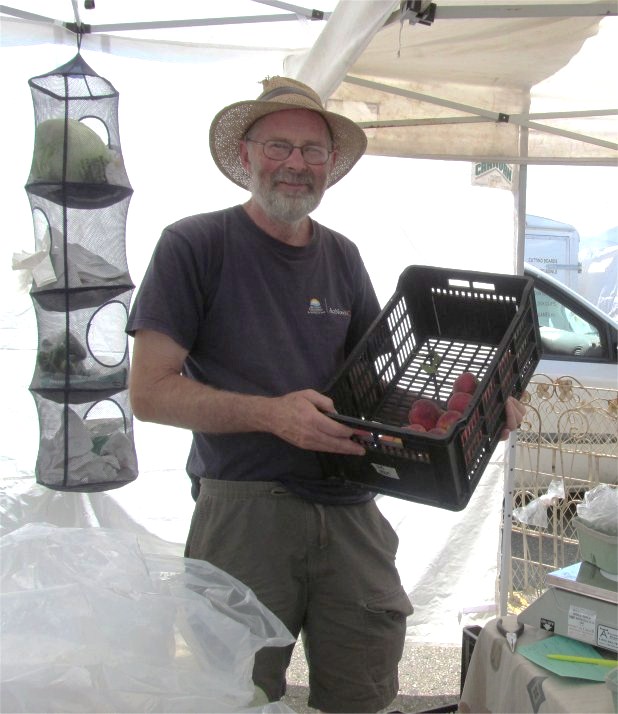 I had come to the Okanagan with a mission: organic peaches were on my mind. As you may know, dear reader, peaches are right near the top of the Dirty Dozen, a couple of fruits below apples, and so one of the best places to put your money when buying organic produce. I’d been warned that I might have to make a side trip to Cawston or Keremeos to find organic growers, as most of the Okanagan fruit in the Kelowna area is chemically produced. At the 11th hour (12:58 in fact, since the stallholders start packing up at 1pm) I was pointed to the Fruit Guy, Michael Welsh, who grows without pesticides and sold me a 20lb case of beauties (he also writes very fine poetry, according to Nancy Holmes, but I didn’t know that at the time.) The catch was I had to drag it back on the bus and get it back to our residence so I could pack it into the car for the morrow’s trip back to Victoria.