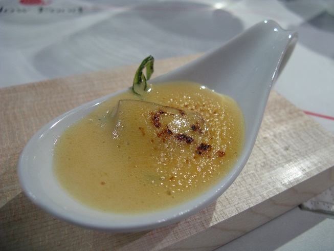 The proof being in the pudding, the third sample was smoked bass on a rucola salad topped with zabaglione. Very nice.