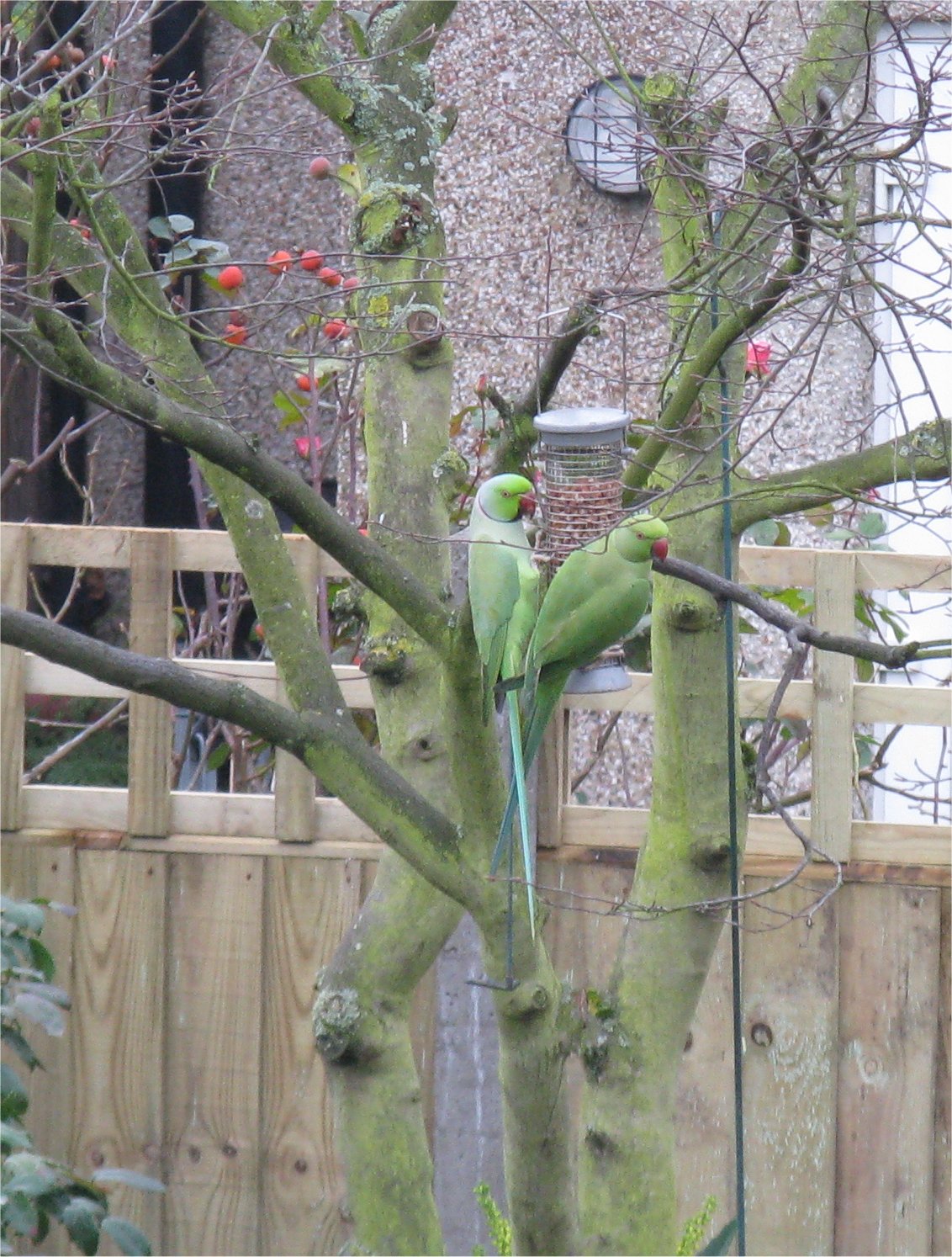 on Saturday. Better news for me than the shopkeepers who are hurting badly this year.It is always a bit surprising in this hemisphere to catch a glimpse of green among the brown at the bird feeders, but apparently escapee parrots have made themselves at home in England. I’ve been watching the bird feeders with interest and notice the big bruisers – wood pigeons, starlings and magpies – are getting most of the action, while the smaller songsters hop around the edges. The year round birdsong is something I do miss about England.