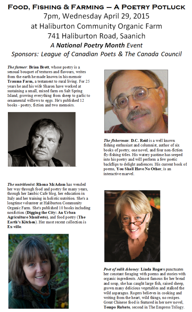 ALECC (1) anosmia (1) aromas (1) bake sale (1) BC poets (4) biodiversity (1) book launch (4) composting (1) cooking workshops (2) Copenhagen (1) environmental literature (2) essays (1) Fanny Bay (1) Fat Oyster Reading Series (1) flavour (1) flax; local grain; local malt; ancient wheat (1) food waste (1) fundraising (1) garbage (1) GHG (1) gluten free baking (1) insect poems (1) invasive species (1) Larder (2) literary readings (1) magazine launch (1) master gardeners (1) memoir (1) methane (1) native plants (1) nonfiction (1) Planet Earth Poetry (1) poems (1) poet laureate (1) poetry (4) poetry readings (9) Poetry videos (5) poetry workshop (1) reading (1) recycling (1) Saskatchewan (1) Saskatoon (1) Seeds (1) seed saving (1) Seed sharing (1) Seedy Saturday (2) taste (1) tent caterpillars (1) victoria poet laureate (1) wild bees (1) wireworm (1) women poets (2)