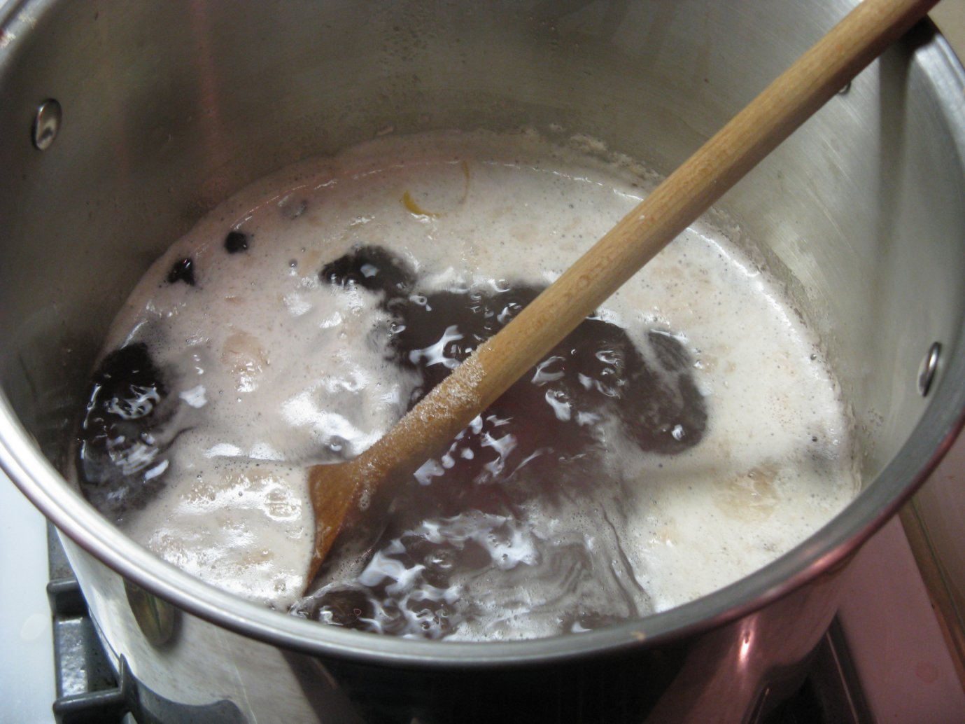 Once the liquid has stopped dripping, return it to the pot with some lemon juice. The sugar, according to my recipe, is measured out (1 pound sugar per imperial pint) and warmed in the oven before adding to the liquid. You then boil it merrily, skimming the foam, until it’s dark and fragrant, and you get a good set. Then jar it up and process as you will.
