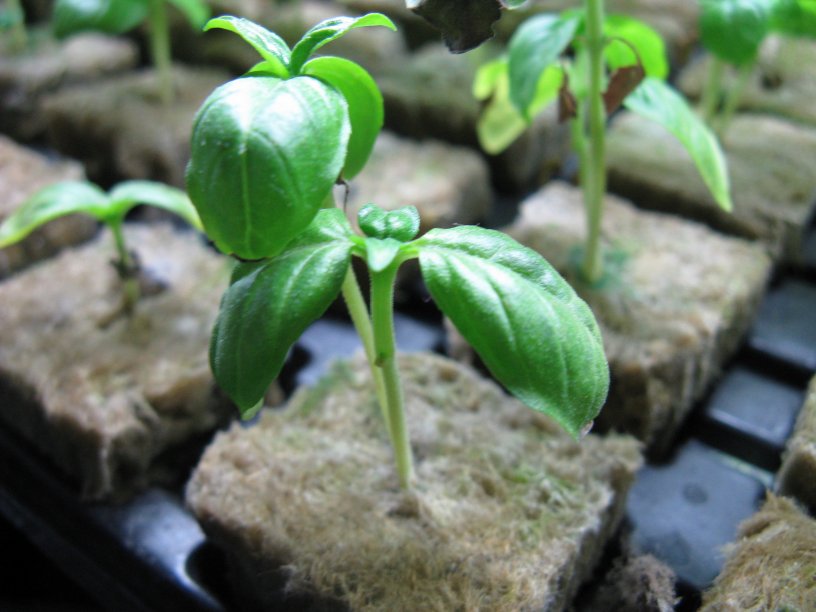 Seedlings are propagated in cubes of rockwool and plastic composites.