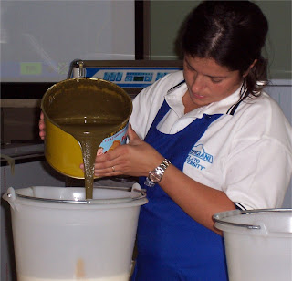 After dutifully noting all that down, we had to wonder anew what was really meant by ‘fresh ingredients’ when we watched the making of gelato. Yes, fresh fruit was used. But so was a powder which included stabilisers and emulsifiers, and protein, in the form of milk powder. And we were told that although fresh milk is a good ingredient, you could as easily use UHT or sterilised milk. To add fat, you could use fresh cream, but you could also use butter (as long as it was industrially-produced butter, made by centrifuge, and not the lower-tech kind made by skimming, as this could introduce bacteria into the mix). And all kinds of calculations come in when adding sugar: dextrose, sucrose, fructose all have different degrees of sweetness which must be balanced with the sugars introduced by fruit or other flavourings. The instructor spoke fondly of the companies who have laboured long to save the gelato maker the toil and trouble of crushing his own pistachios, and produced a neat tin of flavouring ready to pour. Here we see a nice can of hazelnut going into the mix.